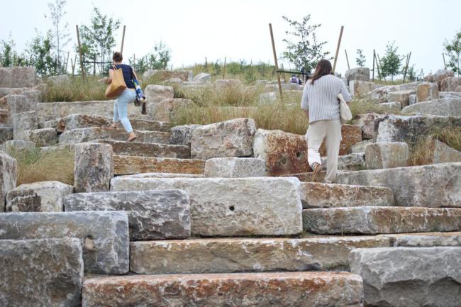 該項(xiàng)目的鋪裝道路周邊裝飾有白石,作為“眼線”,突出坡道和綠草。這些步行道中還鋪設(shè)有回收來(lái)的花崗巖石塊,它們之前是海島防浪堤,已有100多年了。(由于該項(xiàng)目,建筑師摧毀了約1.7米的防浪堤提升彈性。)